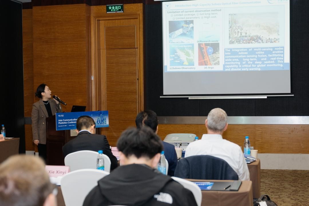 浙江大学谢心怡博士围绕《科学观测通信海缆:基于现有海底通信光缆与海洋传感技术,实现海洋通信-探测一体化》主题演讲,强调了海底应用设计的SMART海缆系统对于实现高容量的光通信以及多维度的海洋监测任务影响与作用。